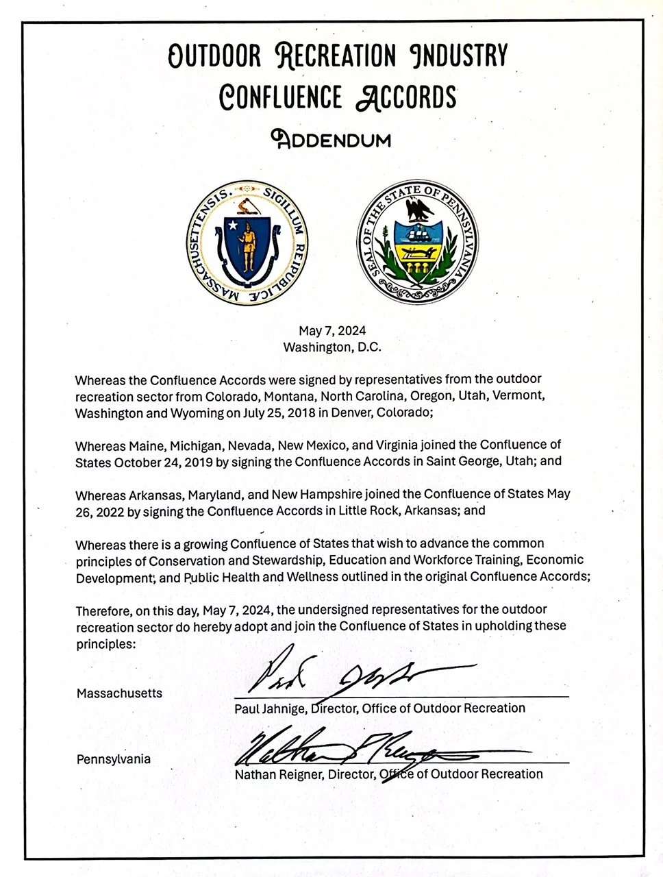 Outdoor recreation leaders from Maine, Michigan, Nevada, New Mexico, and Virginia committed to advance the principles contained in the Outdoor Recreation Industry Confluence Accords, on behalf of their governors, at a signing ceremony today. That brings the total number of states to a historic 13, reminiscent of other revolutionary groups. Read more here.